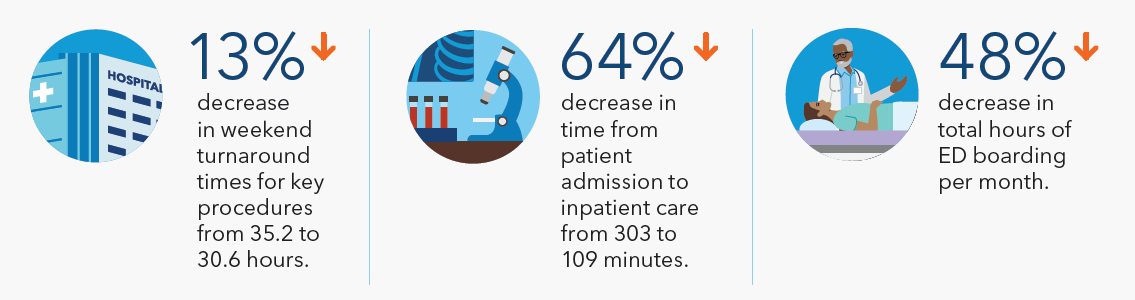 Across all Kaiser Permanente regions, Care Without Delay has reduced length of stay, emergency department wait times, and hospital readmissions – ensuring members receive the right care at the right time.2 The model is now being scaled by Risant Health, a nonprofit organization that brings together like-minded organizations to promote equitable, high-quality patient outcomes across the country. Geisinger, a Risant Health organization, is in the early stages of Care Without Delay implementation and is seeing successful results (see graphic below).3