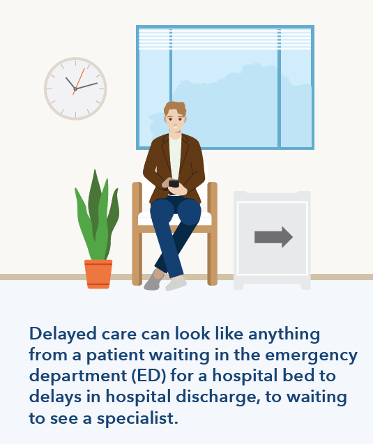 - Care Without Delay teams use real-time data, dashboards, and standardized metrics to drive timely action. Teams monitor wait times, staffing needs, and operational performance. When metrics such as average length of hospital stays, readmission rates, or other avoidable delays miss quality targets, issues are escalated immediately to the appropriate clinical leaders for resolution.