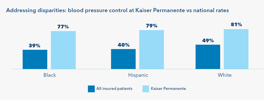 As a result, Kaiser Permanente members experience better care and outcomes compared to all insured patients with hypertension and cardiovascular diseases, our members are more likely to receive and use recommended medications and have controlled blood pressure. (see chart) 23 Kaiser Permanente’s model also supports more equitable outcomes for patients who, on average, experience persistent health disparities. Nationally, Hispanic patients and Black patients with hypertension are approximately 10 percentage points less likely than White patients to have their blood pressure controlled.25 At Kaiser Permanente, Black, Hispanic, and White patients are all more likely to have their blood pressure under control, thanks to quality improvement efforts, innovative care, and strategic research aimed at identifying best practices for addressing preventable differences in outcomes.