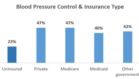 - Hypertension is better controlled among adults with insurance. Hypertension was controlled in just 22% of uninsured adults, compared with 47% among adults with private insurance or Medicare and 40% of adults with Medicaid (see chart).
