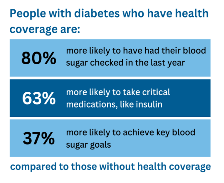 Coverage increases access to the regular care visits needed to develop treatment plans, monitor progress, and support patients in sustaining lifestyle that improve diabetes outcomes. also helps people access needed medications to control their blood sugar.